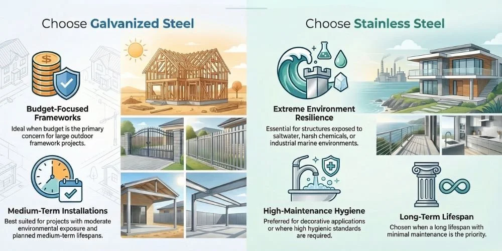 Galvanized steel offers a lower initial cost, making it suitable for large infrastructure applications. However, stainless steel often provides better lifecycle value due to reduced repair, recoating, and replacement needs.